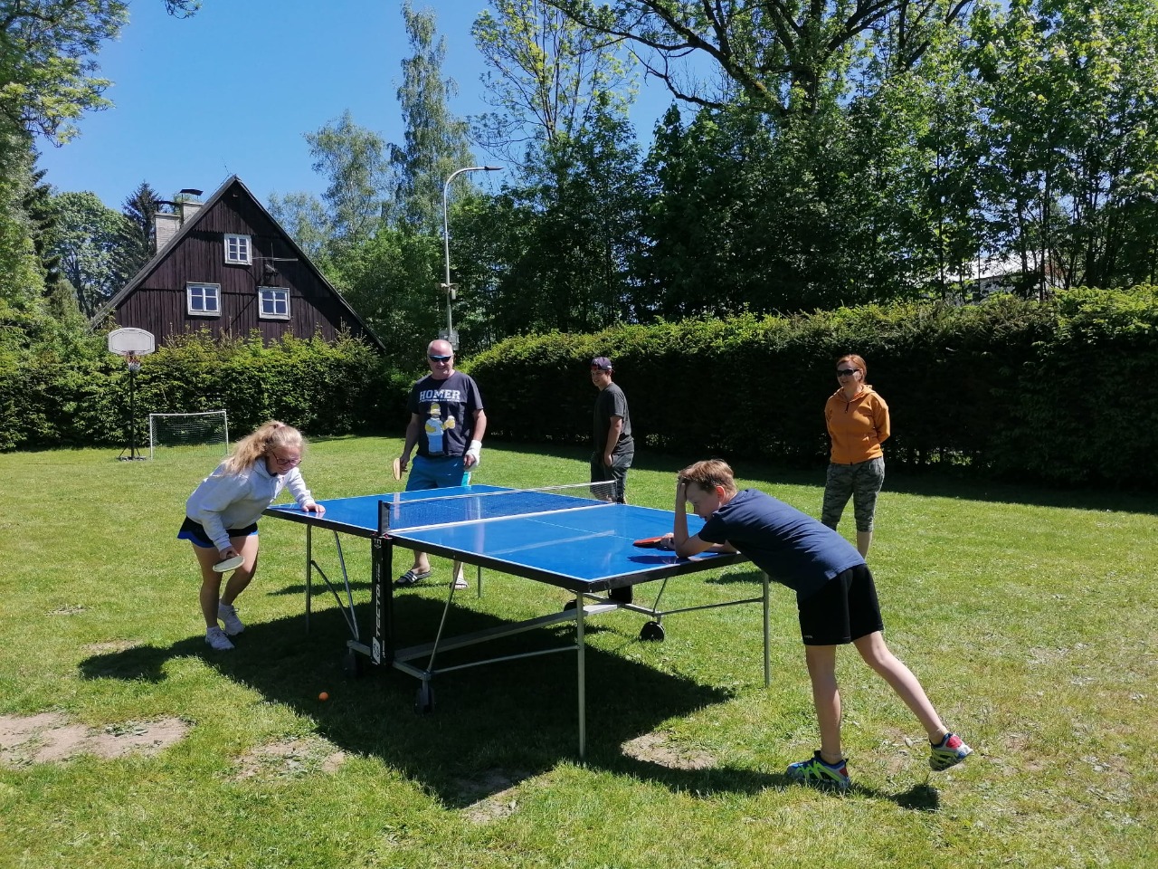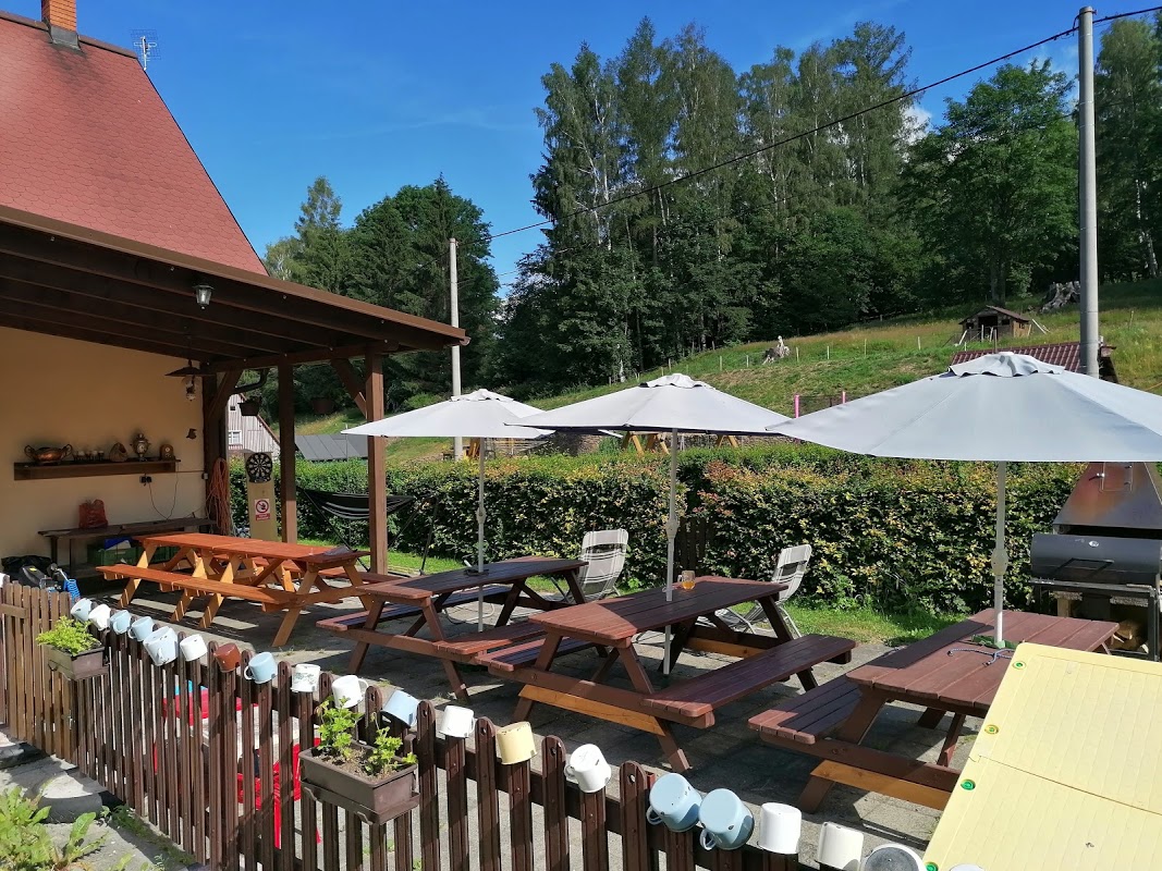 Na hřišti u chaty najdete: trampolínu, pískoviště, dětské houpačky, hamaku, prolézačky, koše na basket, dětskou skluzavku, vyhřívaný zahradní bazén 6x3m se slanou vodou , velké travnaté hřiště pro všechny druhy sportů, stolní tenis, ruské kuželky, zahradní krb na dřevěné uhlí, dřevěné venkovní posezení pod velkou pergolou. Půjčujeme míče, pálky,.... U domu dětský plastový domeček se židličkami a stolečkem.